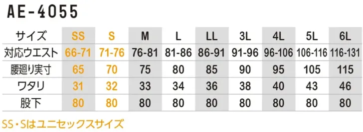 エコ・ストレッチ カーゴパンツ コーコス信岡AE-4055のサイズ表