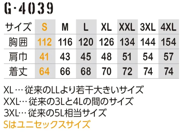 ・サイズ:S~4XL(Sサイズはユニセックス対応 XLは従来のLLより若干大きいサイズ XXLは従来の3Lと4Lの間のサイズ 3XLは従来の5L相当サイズ)