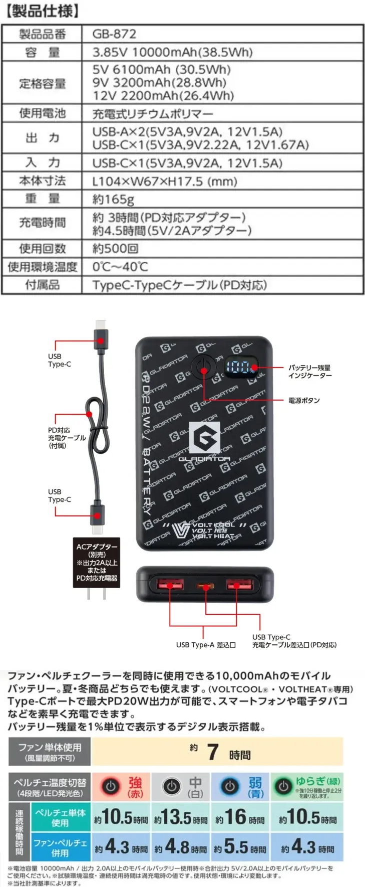 手のひらサイズでハイパワーを実現したGLADIATORのPD対応モバイルバッテリー。10000mAhの大容量と最大PD20W出力により、ファンやペルチェクーラーを安定駆動。デジタル残量表示で電池管理も簡単。