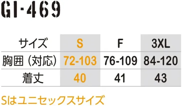 ・サイズ:S F 3XL(Sはユニセックスサイズ)