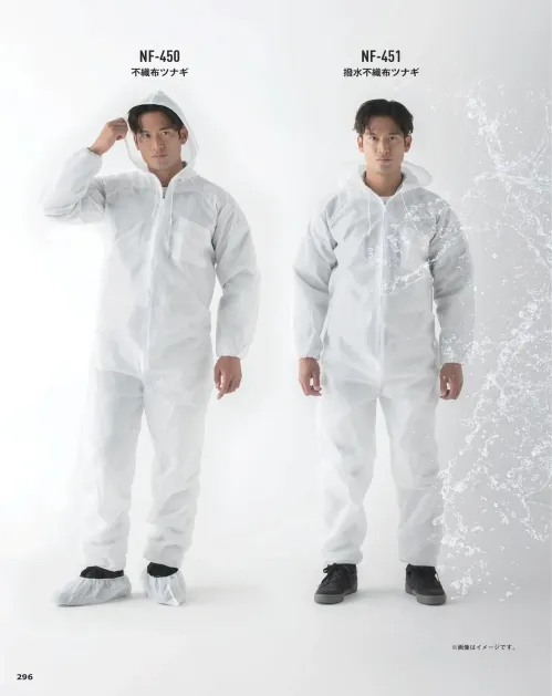 撥水機能を備えた不織布ツナギNF-451は、ポリプロピレン100%の軽量素材に撥水加工を施し、水や汚れの付着を軽減。塗装や粉塵作業、清掃作業など幅広い現場で快適な作業環境をサポートし、衛生的な使い捨て運用にも最適です。