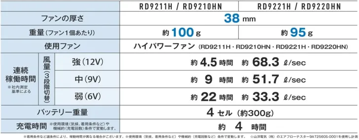 ・バッテリー使用時動作時間(RD9292J使用時):12V 約4.5時間|9V 約9時間|6V 約22時間