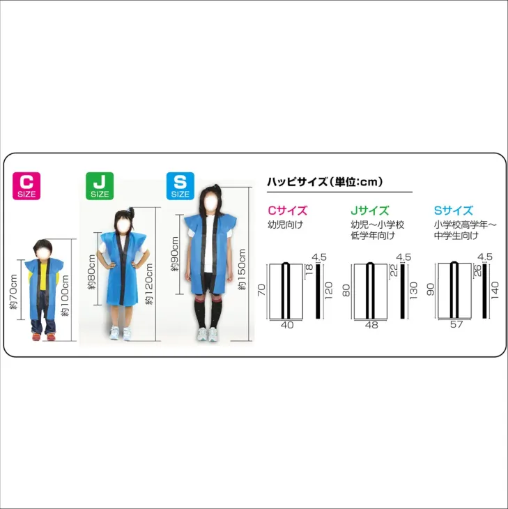安くて丈夫な袖無しロングハッピです。軽さと撥水性を持ち合わせた不織布製です。カラーが豊富なので、クラスやチーム、グループごとに色分けできます。ハチマキ付きなので統一感が出ます。不織布なので加工も簡単です。運動会、発表会、イベントなど幅広いシーンで使えます。幼児向けのサイズです。
