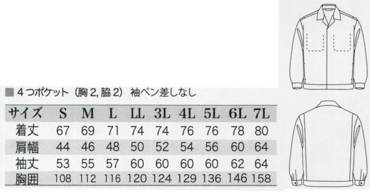 防炎長袖ジャンパー(内ポケット) 三愛B96Kのサイズ表