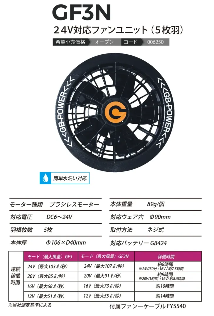 GF3Nファンユニットは、ブラシレスモーターを搭載し、DC6~24Vに対応する高性能モデルです。直径106mmのコンパクト設計ながら、最大107ℓ/秒の強力送風を実現。約89g/個の軽量設計と簡単水洗い対応で、快適かつ清潔に長時間使用できます。