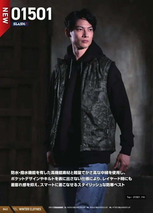 防水・撥水機能を備えた高機能素材と、軽量でかさ高な中綿を使用したSLASH 01501シリーズのライトウォームベスト。表面にキルトを出さないすっきりとしたデザインで、着ぶくれを抑えスマートに着こなせます。レイヤードスタイルに最適な薄手防寒ベストです。