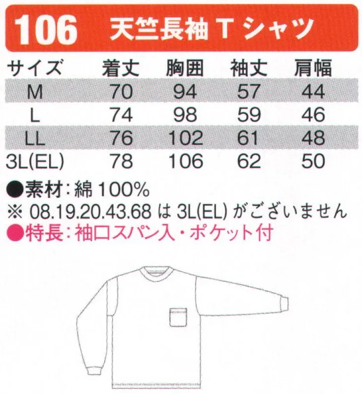 天竺長袖Tシャツ シンメン106-Aのサイズ表