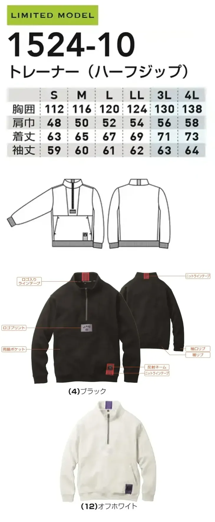 トレーナー(ハーフジップ) 桑和1524-10のサイズ表