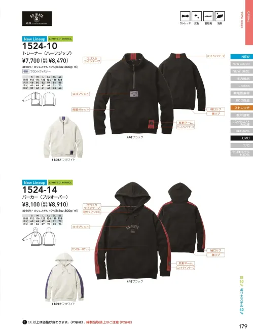 ■形状特長カンガルーポケット・袖口リブ・裾リブ・絞りスピンドル・左腕反射ネーム
