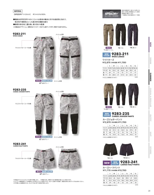 9283 SERIESのサマー対応カーゴハーフパンツ。SPEEDRY®トリコット ポリエステル100%素材を採用し、高い吸水性と速乾性を実現。