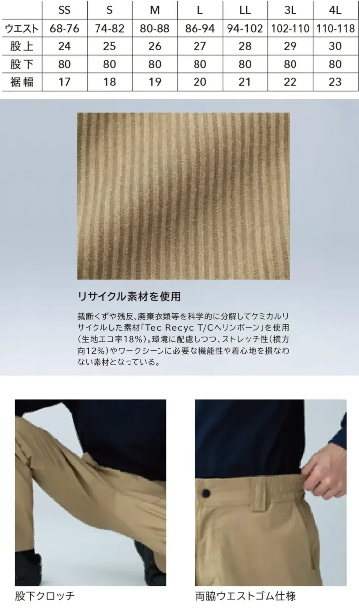 Tec Recycライトパンツ TS DESIGN2202のサイズ表