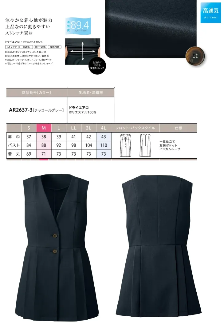 AIRY VEIL エアリーベールシリーズのロングベスト。通気度89.4cc/cm²/secの高通気ストレッチ素材を使用。360度プリーツを施し、体系カバーと動きやすさを実現。ジャケット代わりにも活躍する軽量設計です。