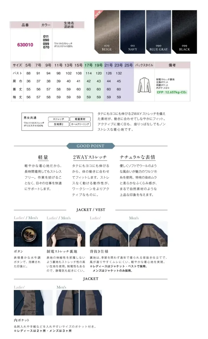 レディースジャケット アイトス (ハイナック)630010-070のサイズ表
