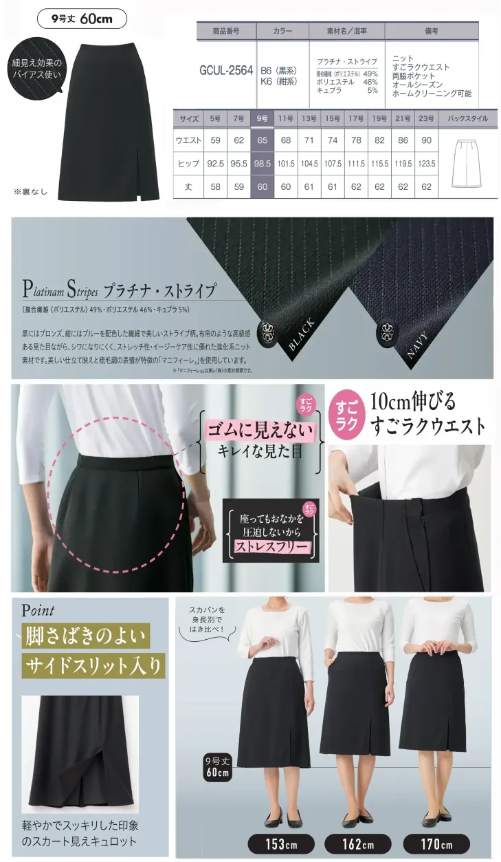ブロンズを配色した繊細で美しいストライプ柄。高級感のある見た目と、シワになりにくくストレッチ性・イージーケア性に優れた進化系ニット素材。櫛毛調の上質な質感が際立ち、美しい仕立て映えが特徴の「マニフィーレ(R)」を使用。長時間の着用でもストレスを感じにくいすごラクウエスト仕様で、ウエストまわりがすっきり見える設計です。やや長めの丈でマーメイドシルエット風の360度スカート見えキュロットなので、アクティブなシーンにも安心。
