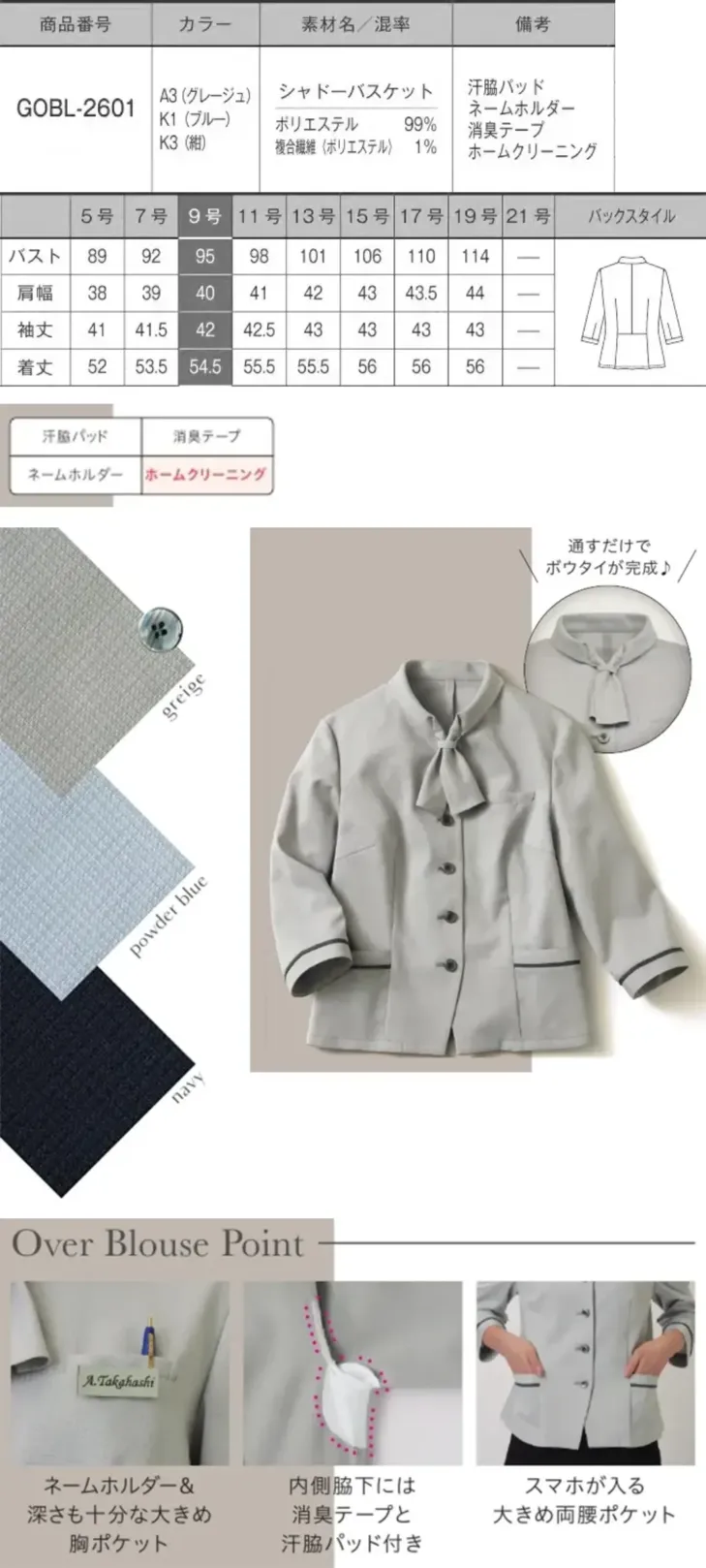 オーバーブラウス(七分袖) サーヴォGOBL-2601-A3のサイズ表