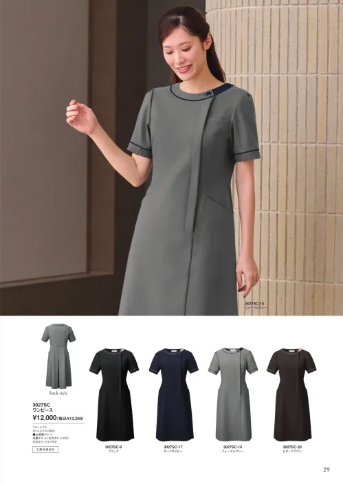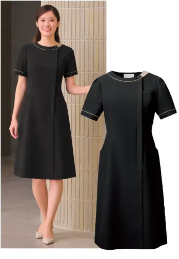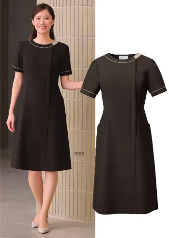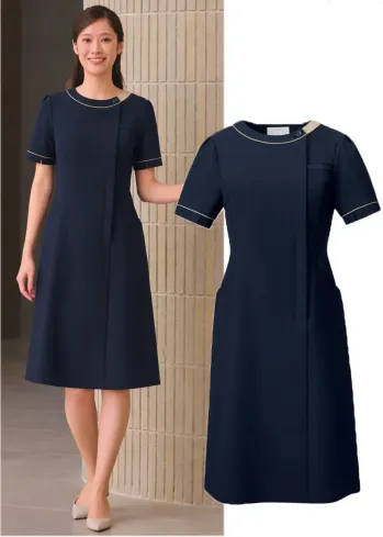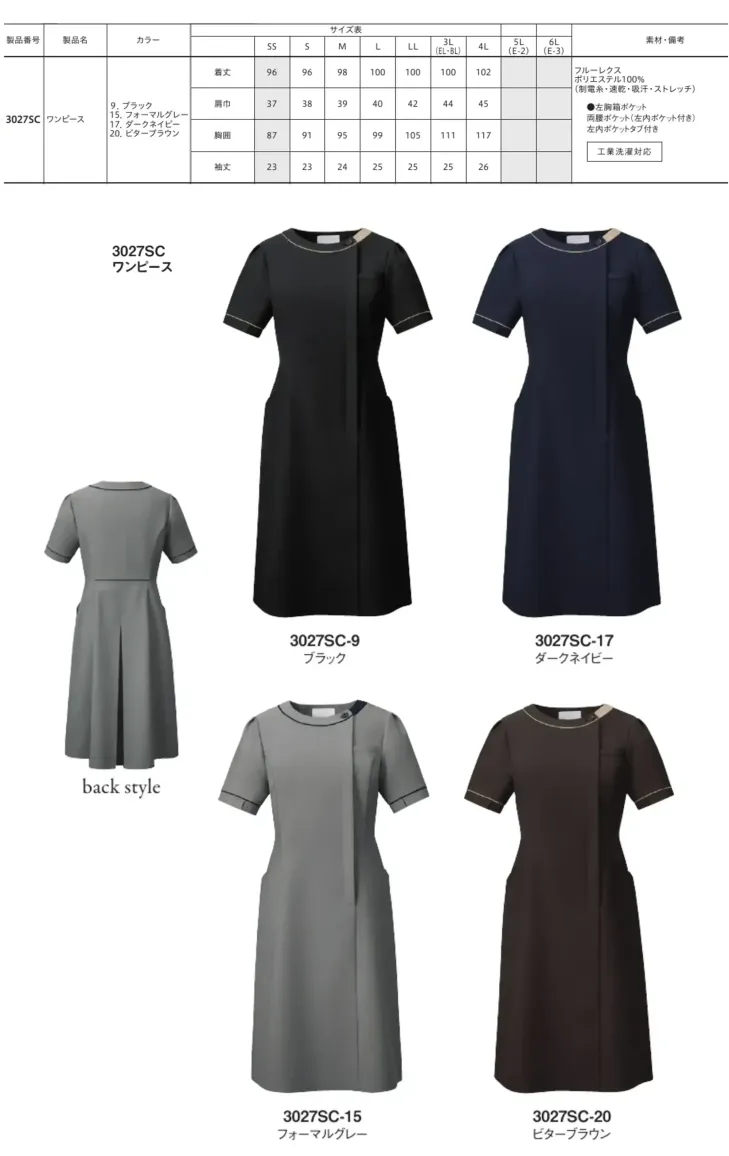 医療・サービス現場に対応する洗練されたデザインの3027SC-15 ワンピース。ポリエステル100%素材を採用し、耐久性とイージーケア性を両立。独自のカッティング技術により美しいシルエットを保ちながら、動きやすさも兼ね備え、長時間の業務でも快適な着用感を実現します。