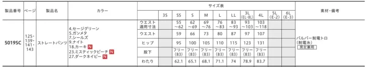 ストレートパンツ フォーク5019SC-27のサイズ表