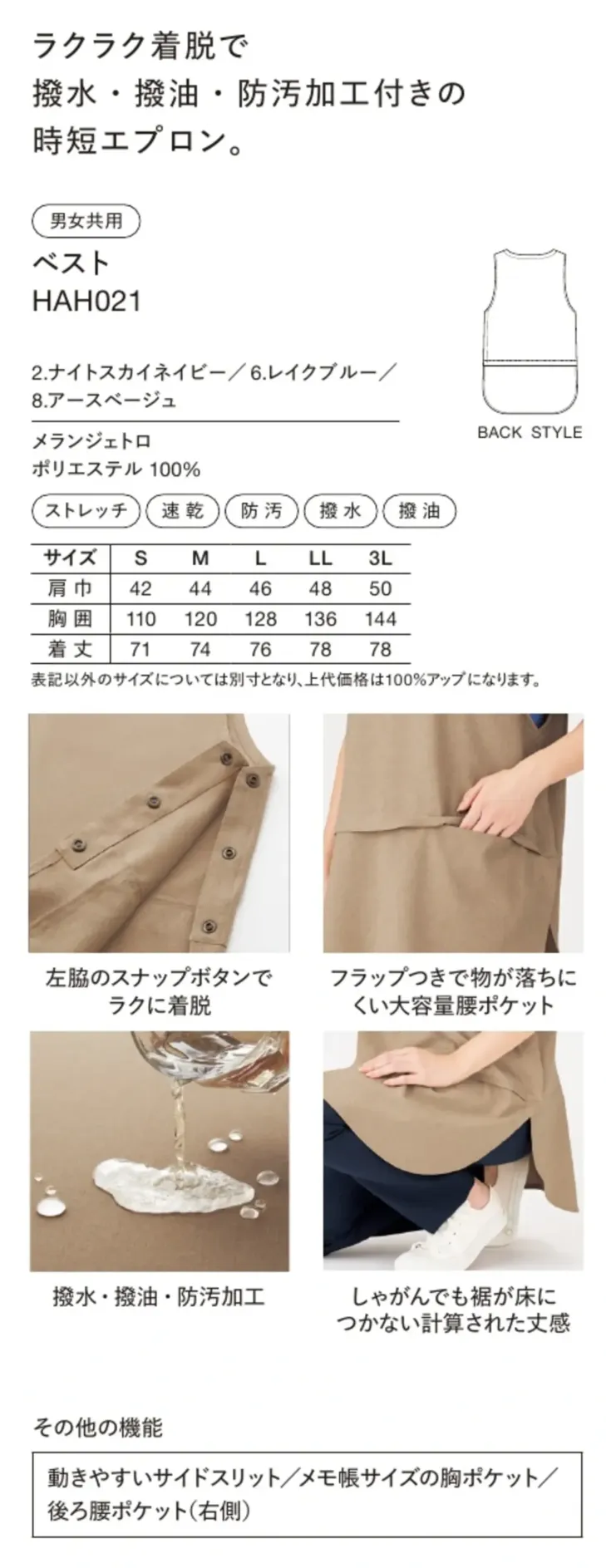 かっぽう着のようにラクラク着脱できる撥水・撥油・防汚加工つきの時短エプロン。