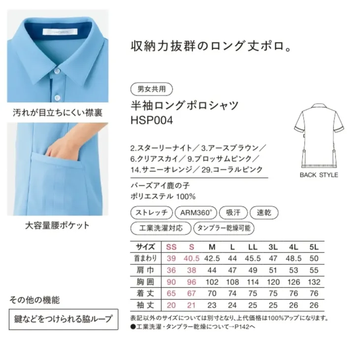 半袖ロングポロシャツ ハンズオンHSP004のサイズ表