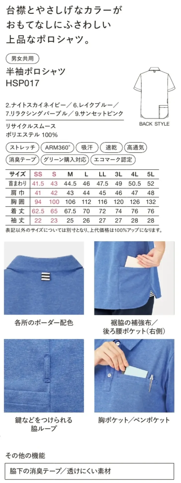 半袖ポロシャツ ハンズオンHSP017のサイズ表