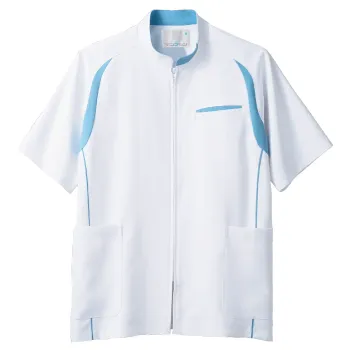 すっきりと見せるライン使いと、白ベースに映える配色が印象的なメンズ半袖ジャケット。ソフトラチネ素材 ポリエステル100%を使用し、しっとりやさしい肌あたりと程よい伸縮性で快適な着心地を実現。動きやすさと上品な印象を両立した一着です。