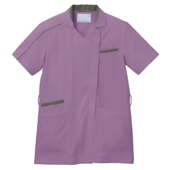 襟付きデザインできちんと感を演出する男女兼用ジップアップスクラブ。表情を引き締める配色効果がアクセントとなり、上品で清潔感のある印象に。