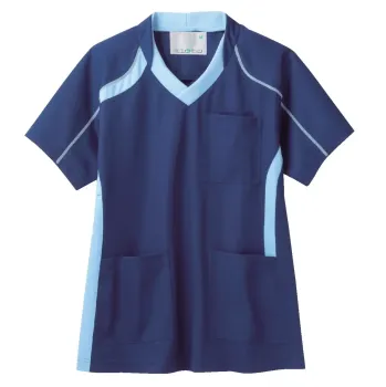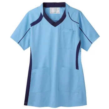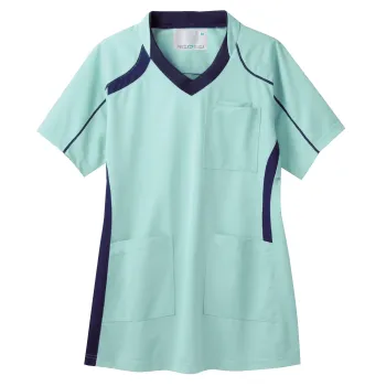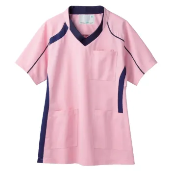 顔まわりをすっきり見せる配色デザインの男女兼用スクラブ。シワになりにくく汚れも付きにくい、お手入れがしやすい素材です。