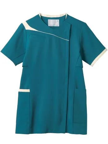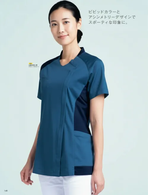 ビビッドカラーとアシンメトリーデザインが目を引く、スポーティな印象のレディーススクラブ。高いストレッチ性を備えたハイパーストレッチトリコット素材を使用し、動きに合わせてしなやかにフィット。現場でのアクティブな動作を快適にサポートします。
