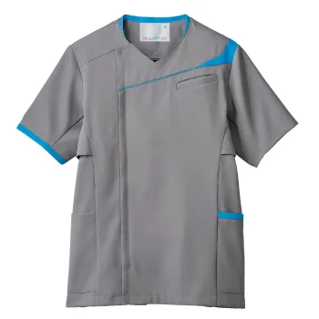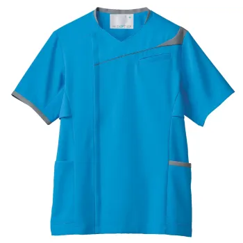 胸元のラインが知的な印象を与える、ソフトラチネ素材のメンズスクラブです。しっとりやさしい肌あたりと程よい伸縮性で、動きに自然にフィット。男女コーディネートができます(女性MS354、男性MS854)。