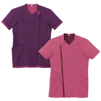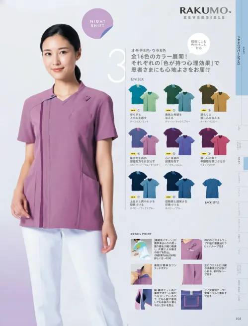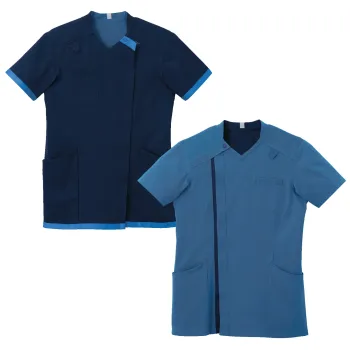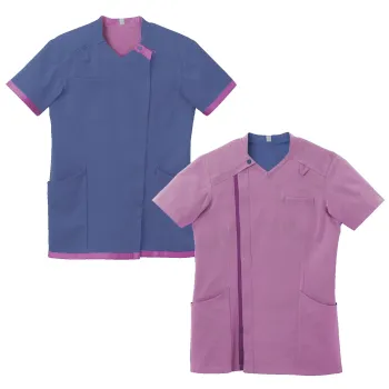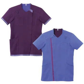 多様化する仕事場の悩みに即効性で応える男女兼用スクラブです。表裏で配色が異なるデュアルトーンツイル素材を採用し一着で業務効率化とコスト削減をサポート。高密度ツイルならではの適度なハリ感と耐久性に加え軽やかな着心地で長時間の業務でも快適に着用できます。