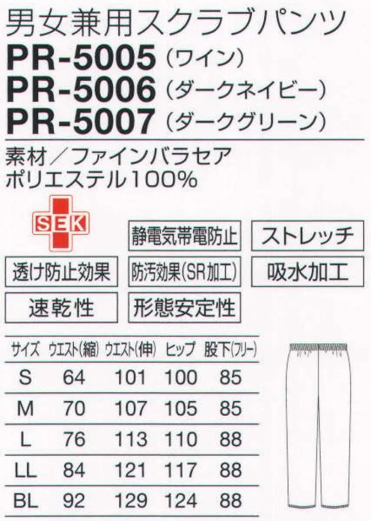 男女兼用スクラブパンツ オンワードPR-5005のサイズ表