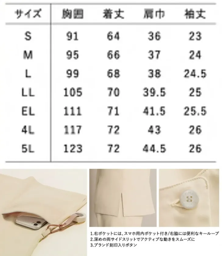 ■形状特長スタンドカラー・両脇スリット・スマホ用内ポケット・キーループ付き