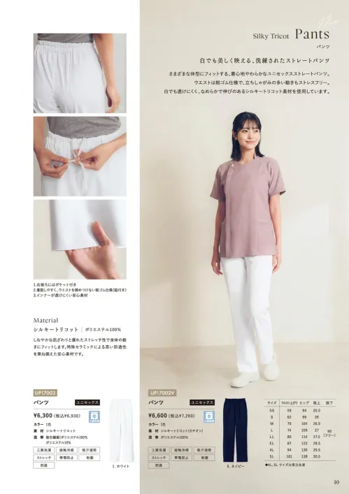 やさしい穿き心地を追求したユニセックス対応ストレートパンツです。なめらかで伸びのあるシルキートリコット素材を採用し、さまざまな体型に自然にフィット。総ゴム仕様のウエストで締め付け感が少なく、立ちしゃがみの多い現場でもストレスフリーな着用感を実現します。