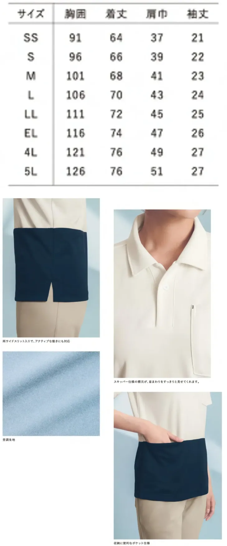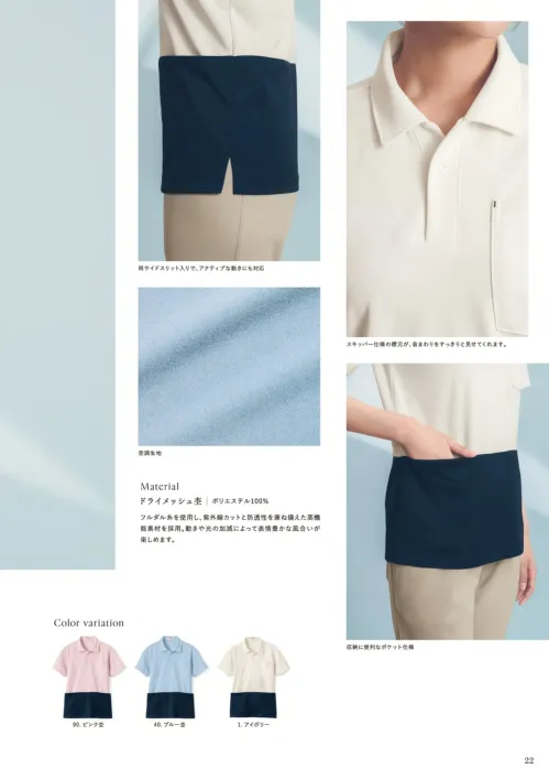 リラックス感のある佇まいと実用性を兼ね備えたユニセックス対応ポロシャツです。柔らかな表情の杢調素材とエプロン風ポケットデザインが自然に馴染み、日常業務に上質なカジュアル感をプラス。ドライメッシュ素材を使用し、吸汗速乾・UVカット機能を備え、快適な着用感が続きます。