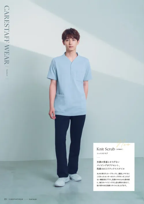 杢調の上質な素材感に、さりげない配色パイピングを効かせたユニセックス対応ニットスクラブです。丸みを帯びたカーブネックとセンター配置のスナップボタンで、脱ぎ着のしやすさと洗練された印象を両立。ドライメッシュ素材ならではの軽やかな着心地で、リラックス感のあるスタイルを演出します。
