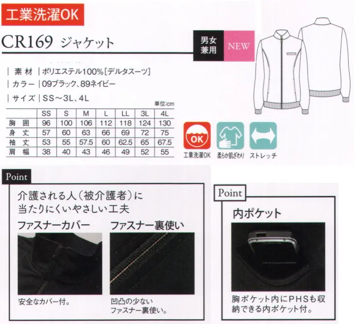 さりげなく効かせたゴールドが上質で格好よく魅せるジャケット。介護される人(被介護者)に当たりにくいやさしい工夫。ファスナーは安全なカバー付。凹凸の少ないファスナー裏使い。胸ポケット内にPHSも収納できる内ポケット付。