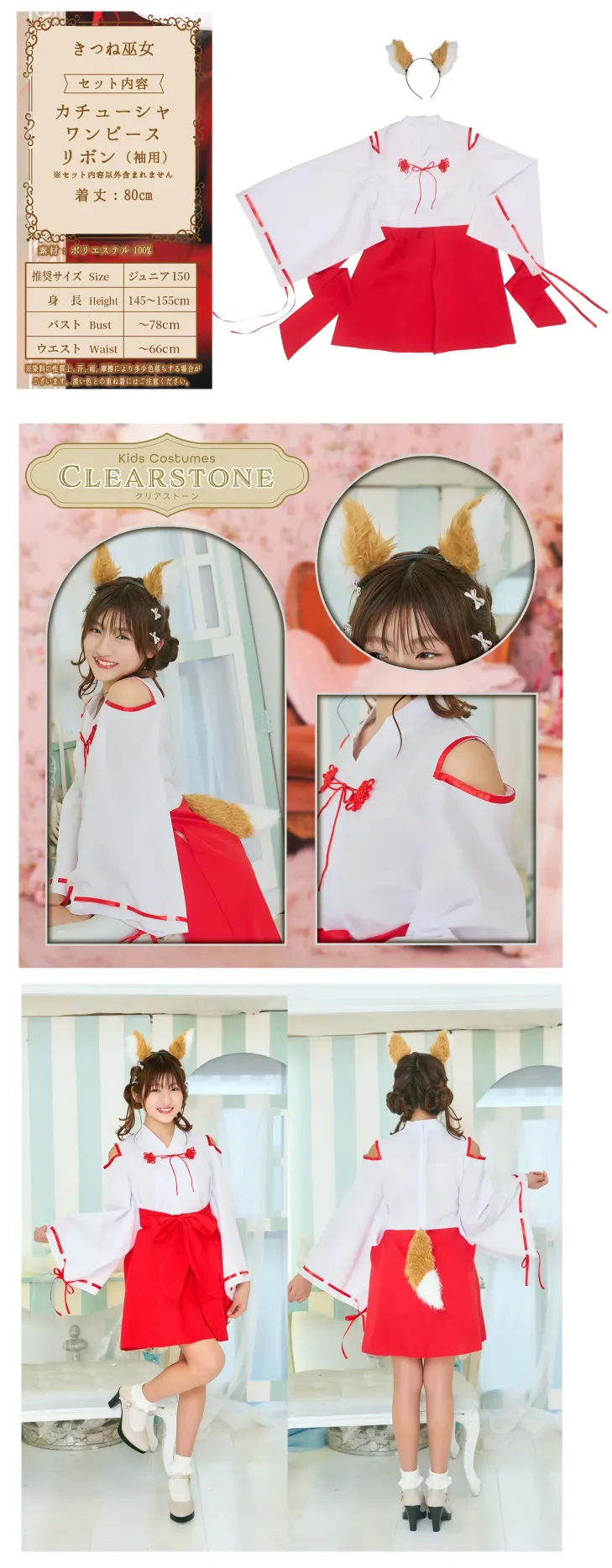 ジュニア向けコスチュームブランド「COSCHU!」。リアルな狐耳と大きなしっぽが特徴のきつね巫女コスチューム。肩のラインを美しく見せるオープンショルダーデザインがポイントです。ワンピースタイプのため着脱がしやすく、コスチューム初心者にも扱いやすい仕様です。狐耳のカチューシャは左右の位置を調整可能で、好みのバランスにアレンジできます。妖怪モチーフや和風テイストの仮装、ハロウィン、撮影イベントなどさまざまなシーンで活躍します。