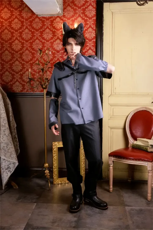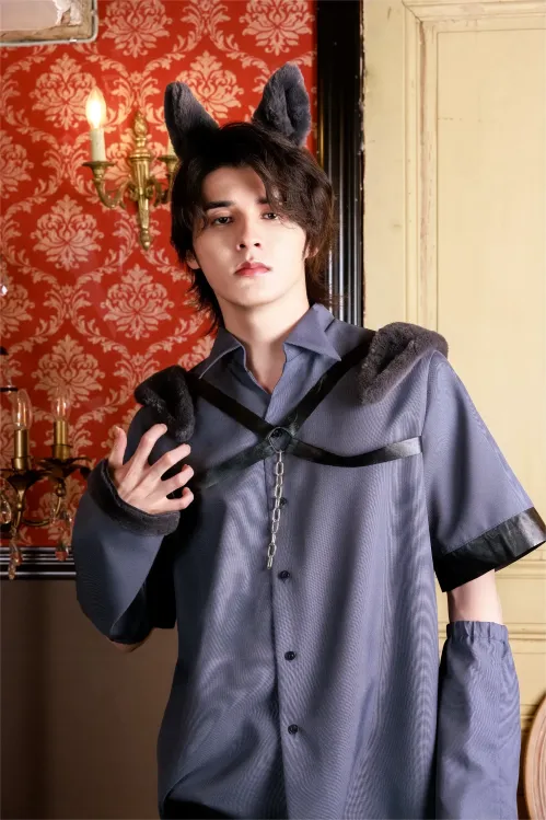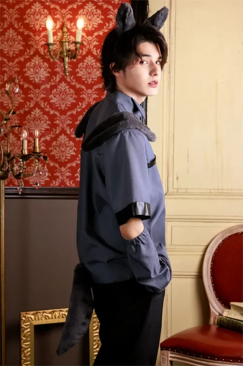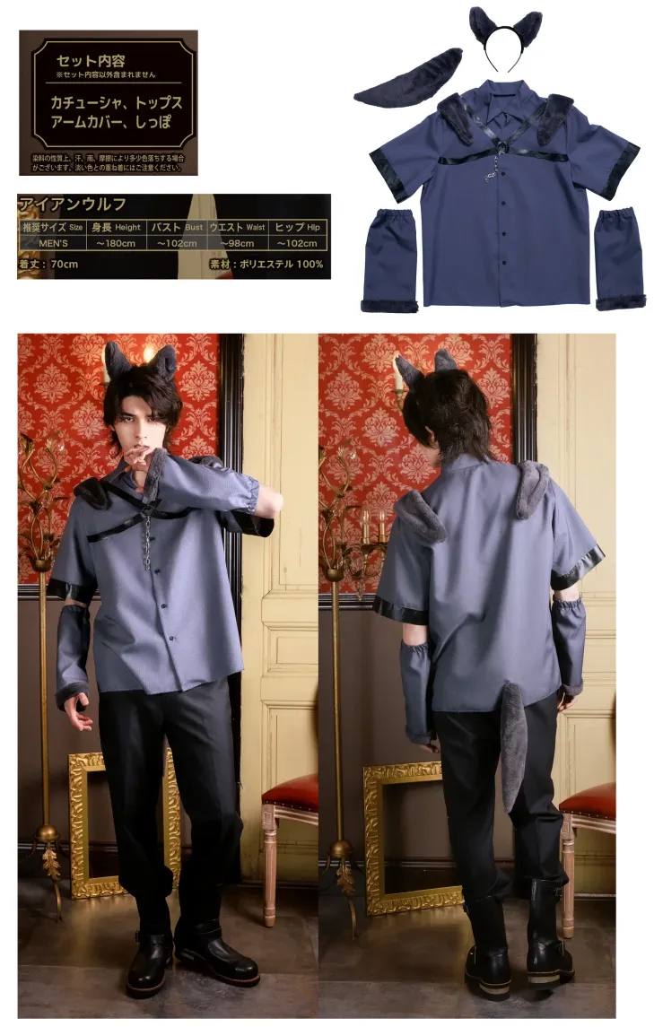 ハロウィン仮装の定番、オオカミのメンズコスチューム。グレーのファーを使用したカチューシャは立体的なつくりでオオカミの耳を再現。肩のファーは二重仕立てでボリュームがあり、後ろ肩まで付いているので振り向きポーズもバッチリ決まります。さらにアームウォーマーの袖口にもファーを使用。腕にはゴムが入っているので体型に合わせてフィットします。トップスには絶妙な色合いのチャコールグレー生地を使用し、黒の合皮テープを組み合わせることでハードさをプラス。さらに胸のシルバーチェーンがワイルドな雰囲気を演出します。中綿がたっぷりと入ったしっぽはピン付きなのでお手入れ簡単。コスプレ初心者さんも挑戦しやすいシャツタイプで、お手持ちのボトムスと合わせるだけでお手軽にハロウィン仮装が完成します。