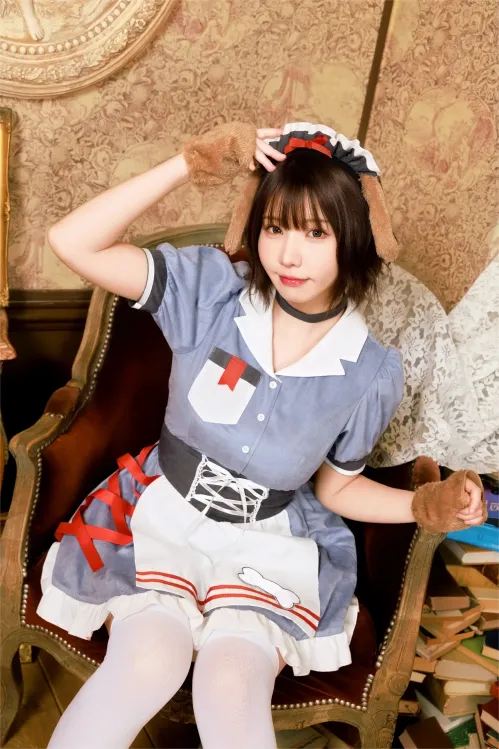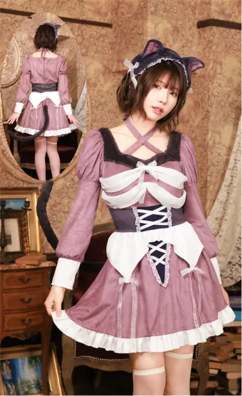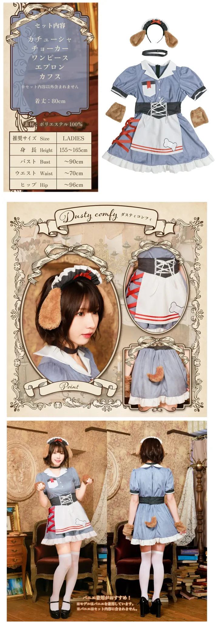 グレイッシュトーンを基調とした暖かみのある雰囲気の「ダスティコンフィ」シリーズ。近年根強く人気なグレイッシュトーン(くすみカラー)をベースに、肌寒いハロウィン時期にもぴったりな秋らしいスエード素材を取り入れました。くすみサックスにレッドが映える犬×ダイナーのコスチューム。耳とカフスは、もこもこのボア素材を使用。コルセット風エプロンでウエストが細見えします。スカートのサイドの編み上げデザインや骨型のワッペンがポイント。※モデルは撮影時にパニエを着用しています。