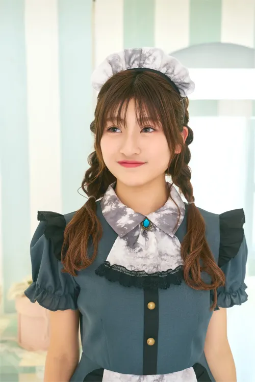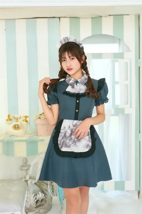 ジュニア向けコスチュームブランド「COSCHU!」。古い洋館に仕えるメイドをモチーフにしたクラシカルなコスチューム。青みがかったくすみグリーンの生地が印象的なカラーリングです。黒のレースとフリルをふんだんに使用し、重厚感のあるデザインに仕上げました。ジャボとエプロンにはオリジナルの汚れ風プリント生地を採用し、アンティークな雰囲気を演出します。ジャボにはエメラルドグリーンの装飾石、胸元にはアンティークゴールド調のボタンをあしらい、細部までこだわった仕様です。袖は大きめのパフスリーブでシルエットにアクセントを加えます。ハロウィン、撮影イベントなどさまざまなシーンで活躍します。