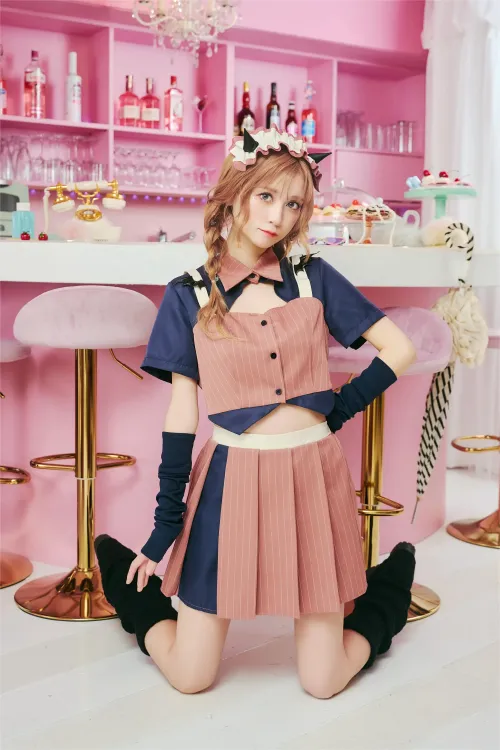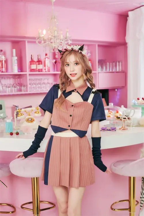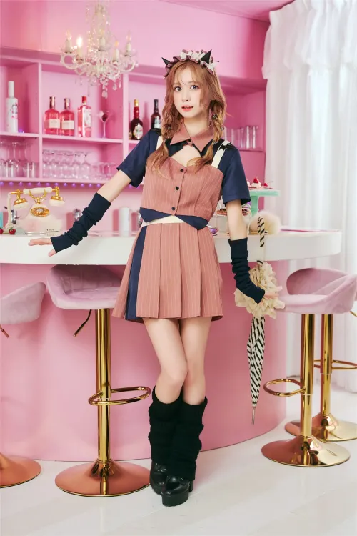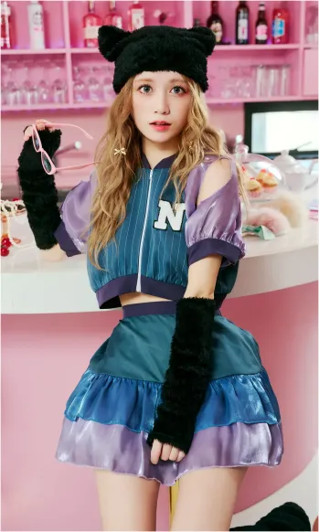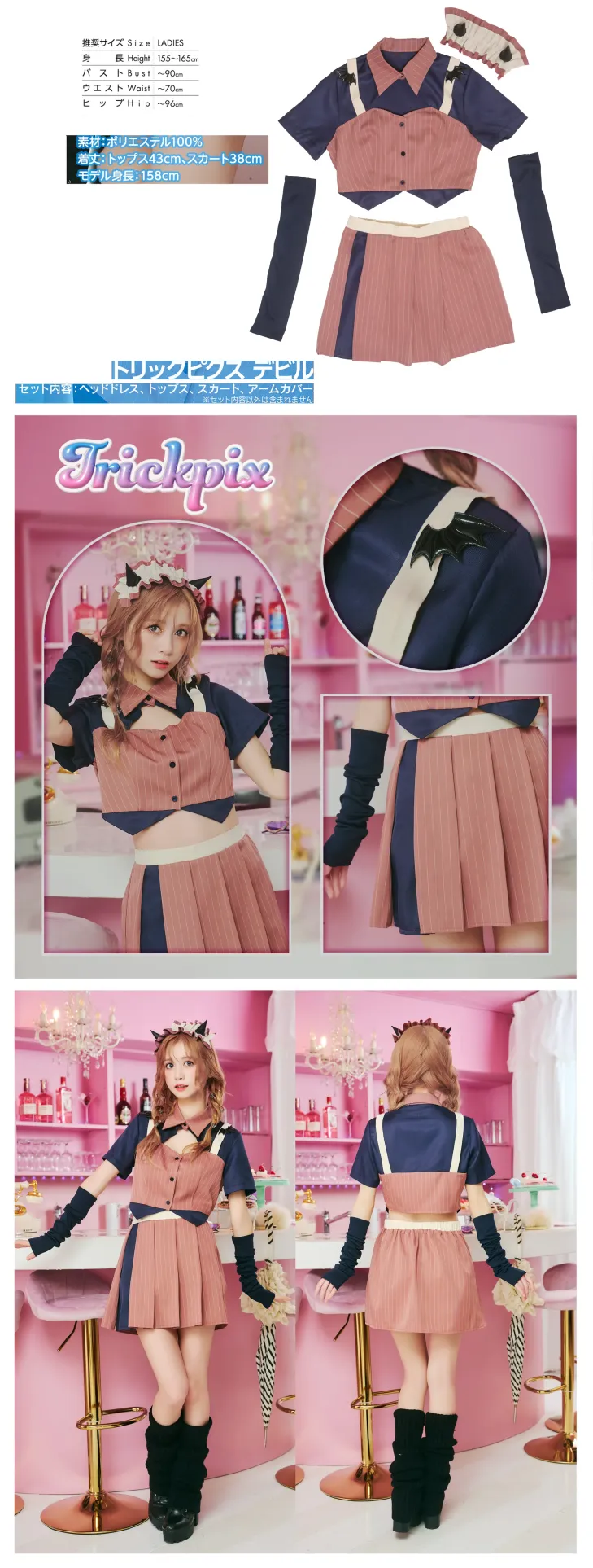ファッショナブルな要素と遊び心あふれるカラーリングが特徴の新感覚のコスチューム「トリックピクス」。クラシカルなピンストライプ柄にネイビーを効かせたセットアップに、ほんのり悪戯っぽさを加えたデビルモチーフのデザインです。トップスはシャツとビスチェをドッキングした作りになっています。肩紐に付いた小さなデビルの羽とヘッドドレスのツノがポイントです。デコルテやウエストが少し開いていることで重たくならず抜け感があります。スカートはアシンメトリーな切り替えとプリーツで動きに軽やかさを与え、スタイルアップも狙えるバランス設計。アームカバーもセットなので、写真や動画でもしっかり映える存在感のあるルックに。ストリート感といたずらな可愛さがミックスされた、注目度の高い一着です。