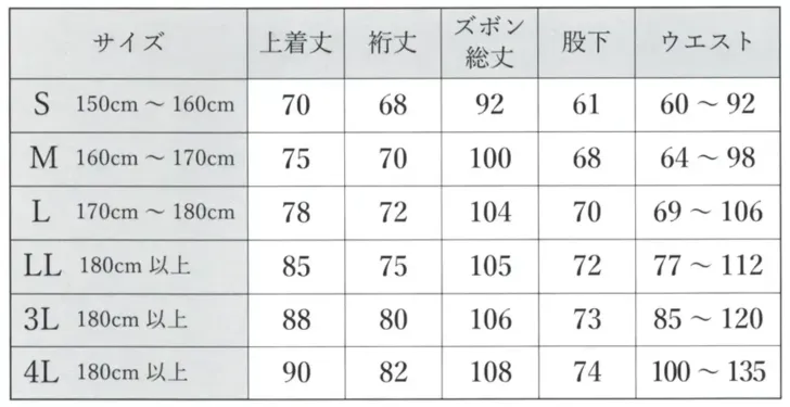 カイハラデニム・11オンス作務衣[改](3L) 伊田繊維5084のサイズ表
