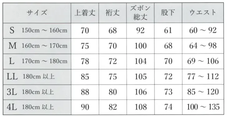 カイハラデニム・11オンス バイオウォッシュ作務衣[改] 伊田繊維5288のサイズ表