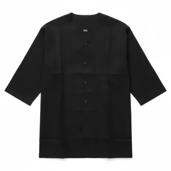 祭りや鳶装束の定番として人気のKN-9380 鯉口シャツ 白は、綿100%素材を使用した着心地の良い一着。しっかりとしたコットン生地が肌に優しく、動きやすさと吸汗性に優れ、長時間の着用でも快適です。シンプルな黒無地は、どんな祭り装束や股引とも相性抜群です。