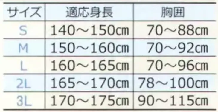 ・サイズ:S(適応身長140〜150cm 胸囲70〜88cm)・M(150〜160cm 70〜92cm)・L(160〜165cm 70〜96cm)・2L(165〜170cm 78〜100cm)・3L(170〜175cm 90〜115cm)