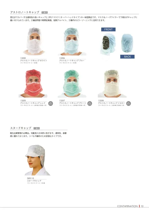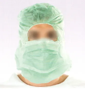 首元までカバーする通気性の良い不織布キャップと2PLYマスク(オーバーヘッドタイプ)の一体型商品です。