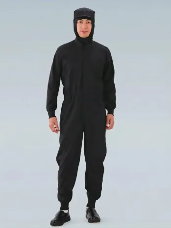 ■形状特長フード付(頭部保護具対応)・上下一体型・裏地なし仕様・顔まわり美額フライス仕様・後頭部スナップボタン・顔まわりスナップボタン・首元ケープ・二重袖・二重裾・メガネホルダー・マスクホルダー・ウエスト調整ゴム