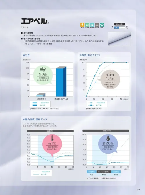 ■素材特長カルゼ織り・超高通気性・高通気度100cc以上・吸汗性・速乾性・蒸散性・制電・低発塵