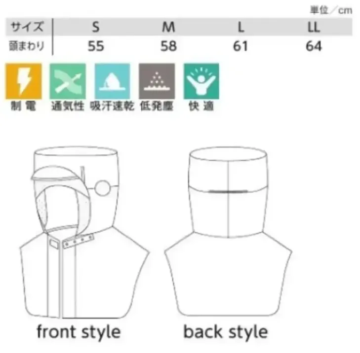 ■形状特長ツバ付き・前開き仕様・頭部保護具対応(Sサイズを除く)・美額フライス・後頭部ゴム・長髪対応設計・メガネホルダー・マスクホルダー・首元スナップボタン