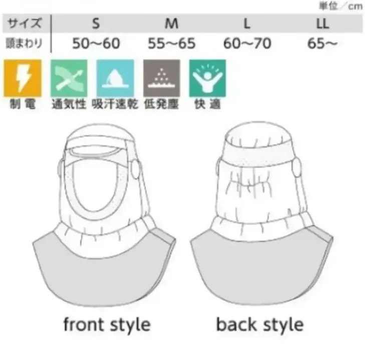 ■形状特長ツバ付き・かぶりタイプ・ヘアーバンド形状・美額フライス二重・頭部保護具対応(Sサイズ非対応)・長髪対応設計・メガネホルダー・マスクホルダー・首元ゴム